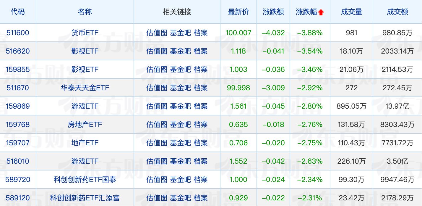 下跌方面,貨幣ETF、影視ETF跌幅均超過3%。