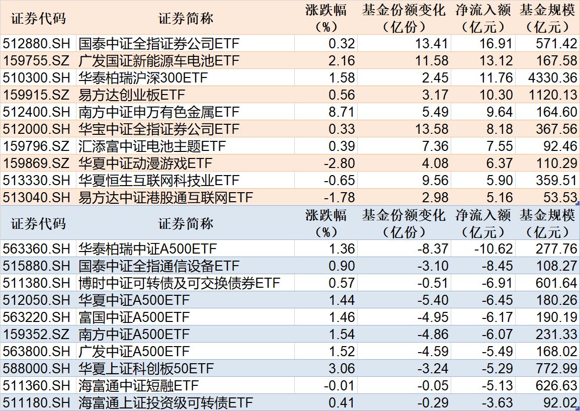 與此同時(shí),華泰柏瑞中證A500ETF基金份額減少8.37億份,凈流出額為10.62億元;國泰中證全指通信設(shè)備ETF基金份額減少3.10億份,凈流出額為8.45億元;博時(shí)中證可轉(zhuǎn)債及可交換債券ETF基金份額減少0.51億份,凈流出額為6.91億元。