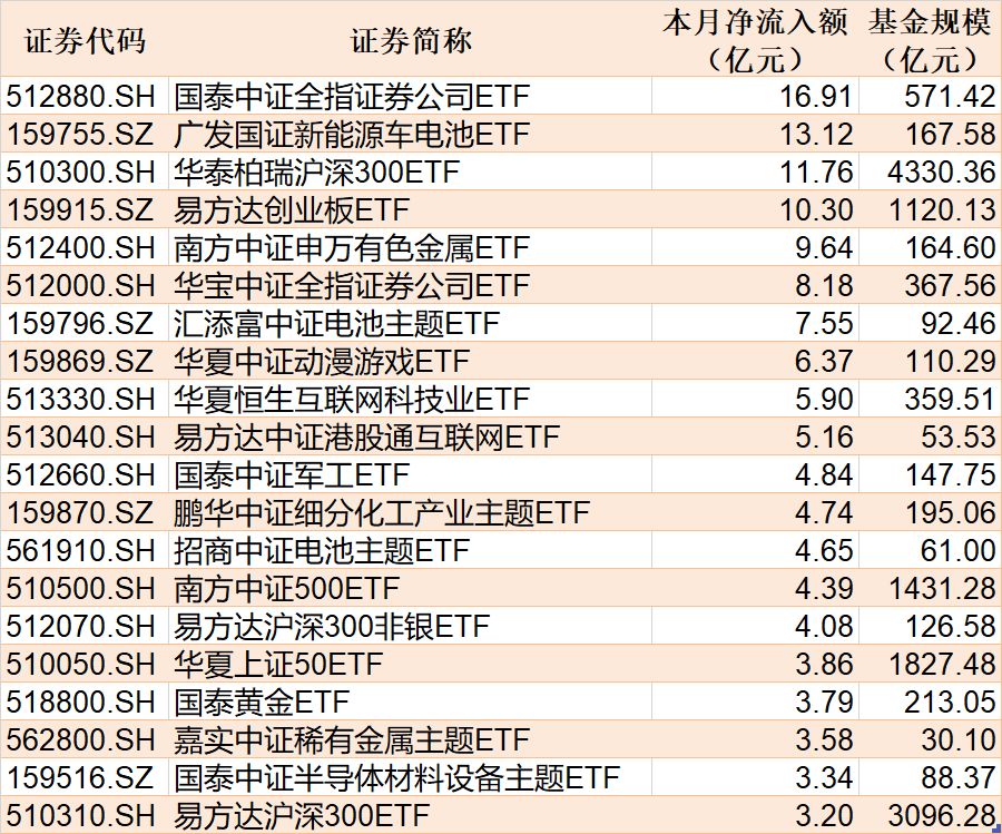 截至10月9日,本月資金凈流入額居前20的ETF名單如下: