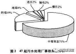 通過對我國污水處理廠事故發(fā)生的類型進(jìn)行統(tǒng)計(jì)和分析可以看出的是污水處理廠事故的類型主要是:中毒窒息、坍塌、淹溺、爆炸、觸電、透水等,而其中最主要發(fā)生的事故類型是中毒窒息事故,發(fā)生的概率是70%。就引起中毒事故發(fā)生的原因來看,硫化氫是引起中毒事故的主要原因,沼氣是引起窒息事故的主要原因。而且中毒事故中容易對工作人員造成人員傷害的主要原因是個(gè)人的防護(hù)用品失去了效果或者并沒有按照規(guī)定在作業(yè)期間使用防護(hù)用品。而且污水處理廠設(shè)備出現(xiàn)缺陷、錯(cuò)誤的操作、設(shè)施沒有達(dá)到規(guī)定的標(biāo)準(zhǔn)、通風(fēng)不良等都是造成人員傷亡的原因,但是個(gè)人防護(hù)用品的使用是引起中毒窒息事故中人員傷亡的主要原因,發(fā)生率高達(dá)78%。