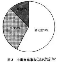 分析研究中分別對中毒窒息的物質(zhì)進(jìn)行了統(tǒng)計(jì)與分類。結(jié)果表明占總事故數(shù)57%的是硫化氫引起的中毒事件。占總事故31%的是沼氣引起的中毒事件。其他原因引起的事故占12%,經(jīng)過分析還可以發(fā)現(xiàn)的是硫化氫引起的主要是中毒事故,沼氣引起的主要是窒息事故。
