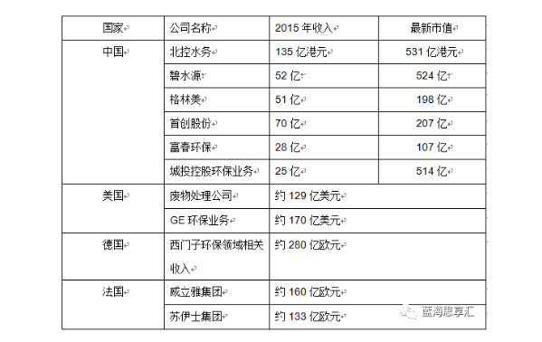 2016年環(huán)保PPP項(xiàng)目數(shù)量978個(gè),項(xiàng)目投資需求高達(dá)5264億。已成為PPP項(xiàng)目中的重要構(gòu)成部分。 4、借力資本市場(chǎng),環(huán)保產(chǎn)業(yè)亟需龍頭企業(yè) 對(duì)比國(guó)外巨頭,國(guó)內(nèi)環(huán)保企業(yè)規(guī)模差距是比較大的。因此必須借助資本市場(chǎng),加強(qiáng)整合并購(gòu),盡快培育龍頭企業(yè)。
